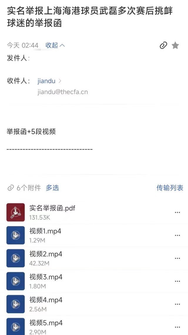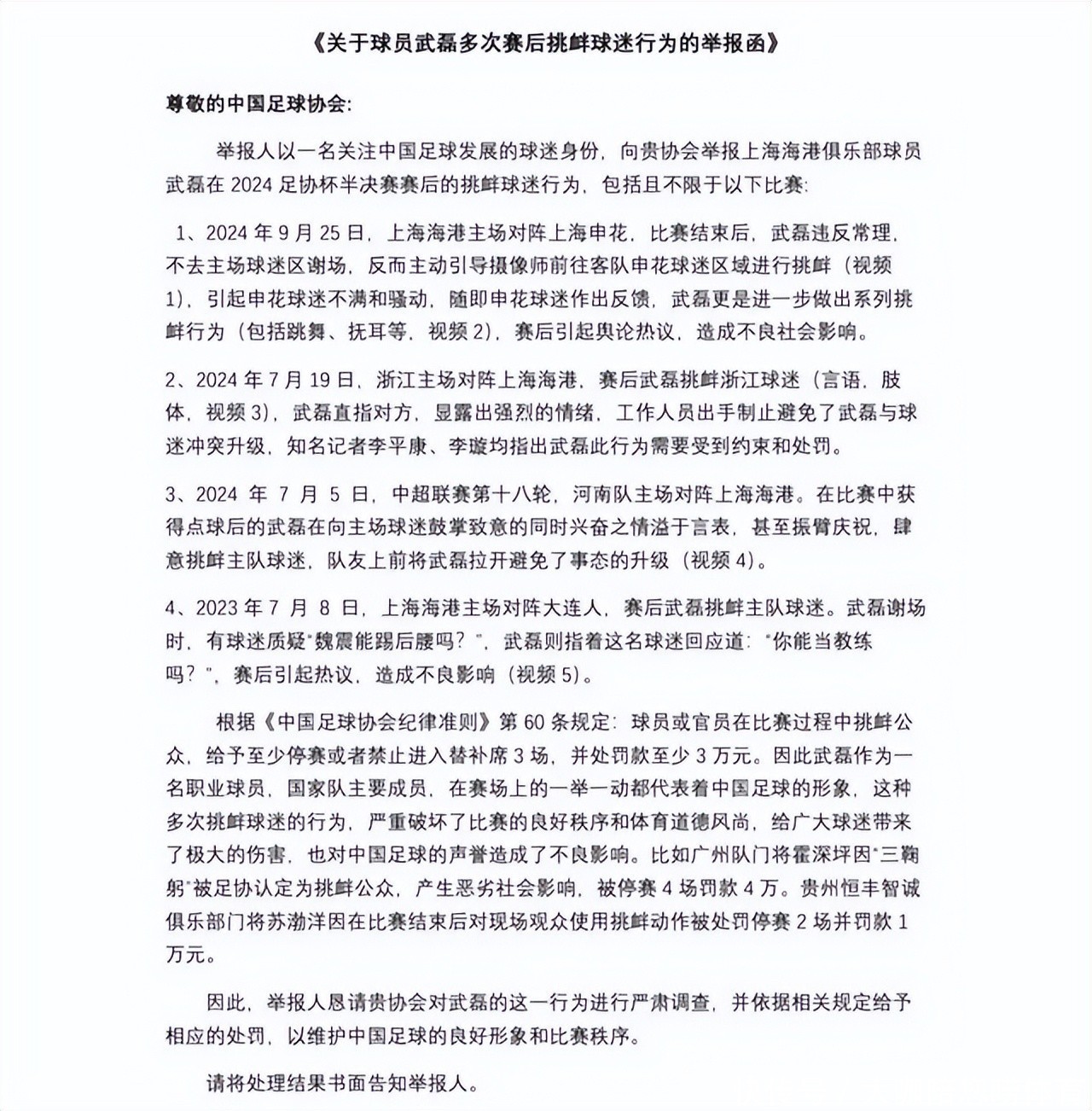 媒体报谈中袒露,球迷实名举报武磊,称武磊在比赛中屡次寻衅球迷。以足协杯半决赛上海海港队与上海申花队的比赛赛后为例。上海海港队谢场的期间,武磊莫得去到上海海港队球迷的方阵,而是来到上海申花队球迷的方阵。更令东谈主可气的是,武磊还作念出寻衅的动作。也正因为如斯,有球迷进行实名举报,称武磊还是屡次寻衅球迷。举报的期间,该球迷附上了多个视频。这也称得上是根据可信!