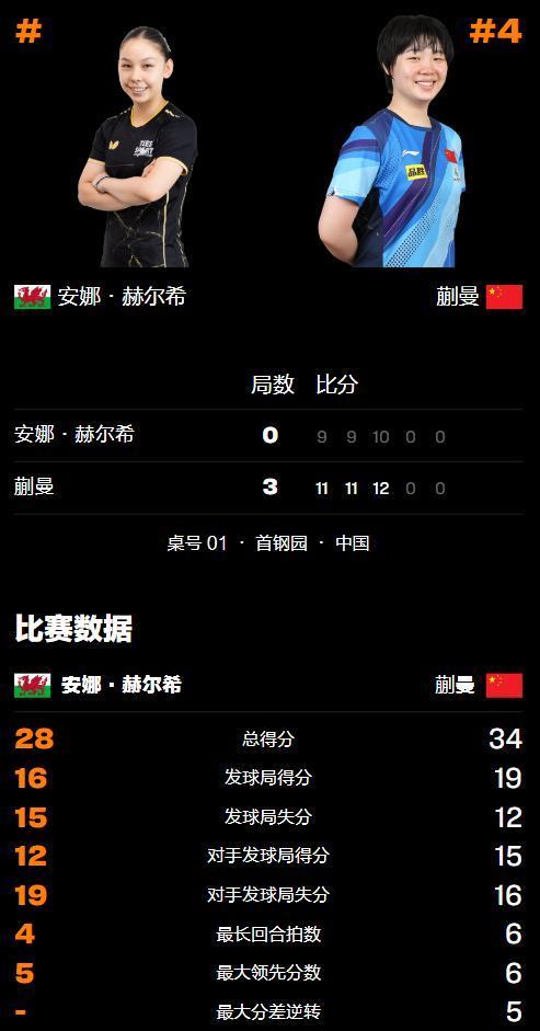 弗成再输的安娜·赫西,第三局威望如虹,早早就缔造起了6-1的进步,不外手持大比分上风的蒯曼,心态涓滴不慌,稳住阵地后运行追分,打了敌手一个3-0后,迫使安娜·赫西叫暂停改造,再行回到赛场之后,蒯曼凭借更高的单板质地,依旧压制住敌手,遂愿以12-10锁定胜局
